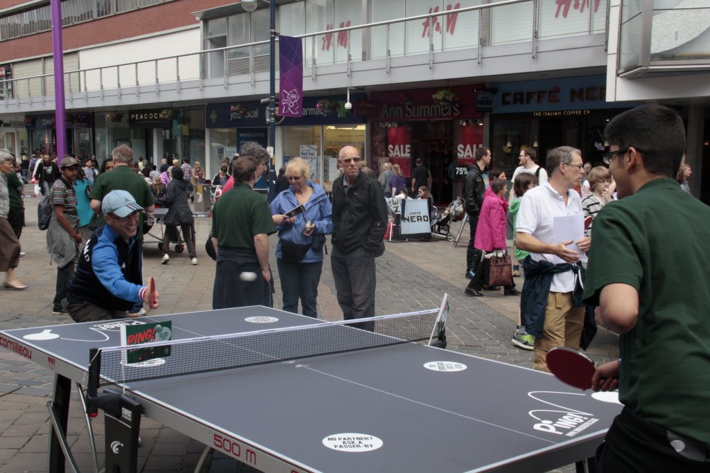 Steve White has been playing ping-pong for about 50 years and is one of the organiser’s of Leicester’s Ping Festival. He said: “I love Leicester and I love table tennis, and this is like a dream come true. It is good to see so many people playing today, we are giving them the chance to be healthier, we provide them with some coaching, and we’re bringing communities together as well.