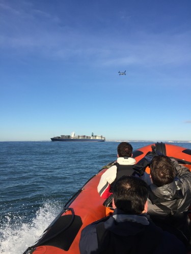 The English Channel is the busiest shipping lane in the world and the drone and the boat had to dodge between two large vessels.